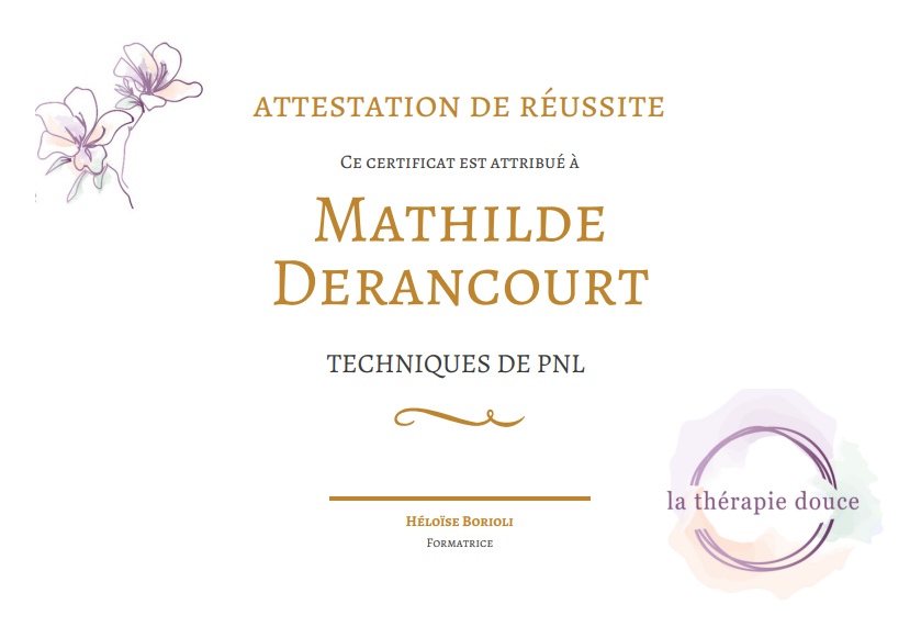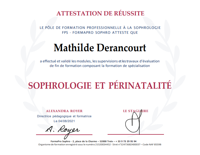 Je suis désormais diplômée en sophrologie, certifiée RNCP (diplôme d'Etat), et spécialisée en périnatalité (du désir de parentalité au post-partum).