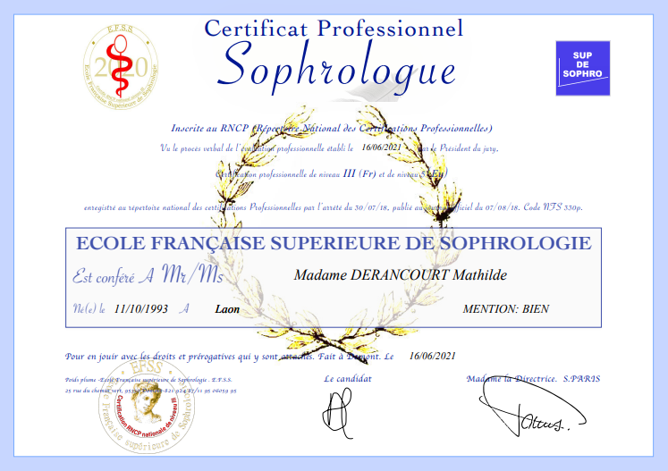 Ecole Française Supérieure de Sophrologie, certifiée RNCP niveau III, Mars 2021